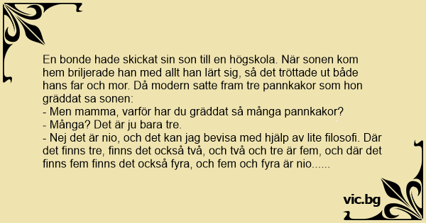 En bonde hade skickat sin son till en högskola. När sonen kom hem briljerade han med allt han lärt sig, så det tröttade ut både hans far och mor. Då modern satte fram tre pannkakor som hon gräddat sa sonen:
