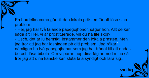 - Usch, det är ju hemskt, instämmer den lokala prästen. Men jag tror att jag har lösningen på ditt problem. Jag råkar nämligen ha två papegojhanar som jag har tränat till att endast be och läsa bibeln. Om vi parar ihop dina fåglar med mina så tror jag att dina kanske kan sluta tala syndigt och lära sig något ur den heliga skrift istället.