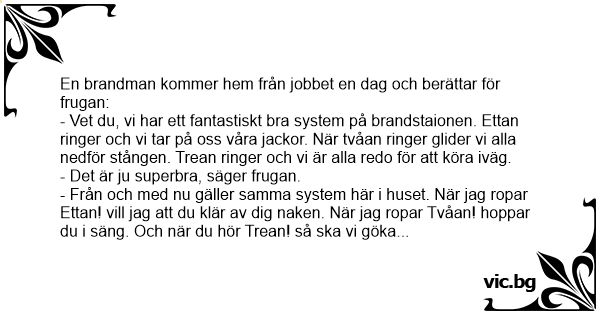 Så nästa kväll när han kommer hem från jobbet och skriker Ettan! tar frun av sig alla kläder. Han skriker Tvåan! och hon hoppar i säng. Trean! grymtar han, och dom börjar göка. Men efter bara några minuter skriker frugan: