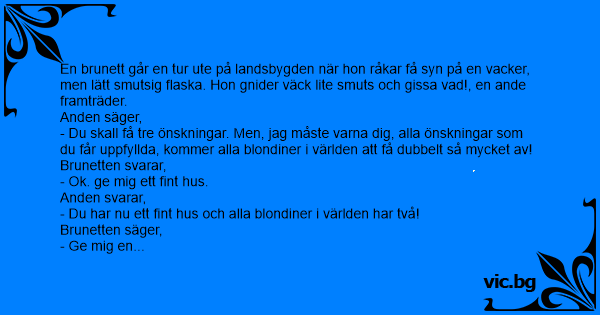 - Du skall få tre önskningar. Men, jag måste varna dig, alla önskningar som du får uppfyllda, kommer alla blondiner i världen att få dubbelt så mycket av!