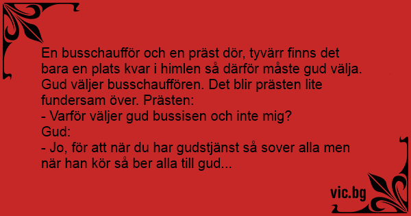 En busschaufför och en präst dör, tyvärr finns det bara en plats kvar i himlen så därför måste gud välja. Gud väljer busschauffören. Det blir prästen lite fundersam över. Prästen: