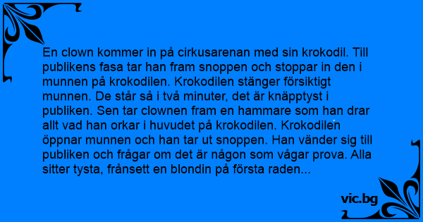 En clown kommer in på cirkusarenan med sin krokodil. Till publikens fasa tar han fram snoppen och stoppar in den i munnen på krokodilen. Krokodilen stänger försiktigt munnen. De står så i två minuter, det är knäpptyst i publiken. Sen tar clownen fram en hammare som han drar allt vad han orkar i huvudet på krokodilen. Krokodilen öppnar munnen och han tar ut snoppen. Han vänder sig till publiken och frågar om det är någon som vågar prova. Alla sitter tysta, frånsett en blondin på första raden som räcker upp handen och säger: