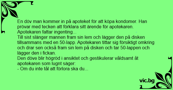 En döv man kommer in på apoteket för att köpa kondomer. Han prövar med tecken att förklara sitt ärende för apotekaren.