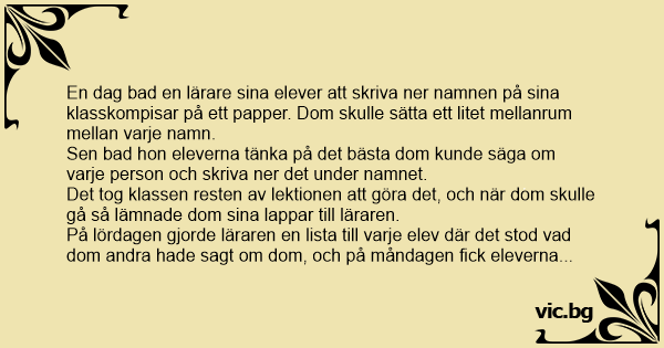 På lördagen gjorde läraren en lista till varje elev där det stod vad dom andra hade sagt om dom, och på måndagen fiск eleverna var sin lista. Efter ett tag log eleverna.