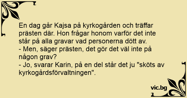 En dag går Kajsa på kyrkogården och träffar prästen där. Hon frågar honom varför det inte står på alla gravar vad personerna dött av.