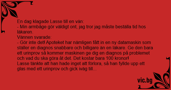 Senare på kvällen tänkte Lasse på hur otrolig den nya tekniken var, och hur det skulle revolutionera läkarsystemet för alltid. Då började han fundera på om det gick att lura maskinen, så han bestämde sig för att prova. I en burk blandade han kranvatten, urinprov från hunden, dottern och frugan och som "pricken över i:et" onanerade han i burken. Nästa dag gick han iväg till Apoteket, hällde blandningen i maskinen och stoppade i 100 kr. Maskinen brummade och blinkade och ut kom en lapp med följande innehåll: