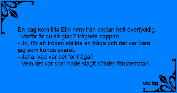 Lille Per kom hjem fra skolen. – Hva lærte du i dag, da? spurte moren. – Frøken spurte om noe som bare jeg kunne svare på. – Hva var det, da? – Hvem som knuste ruta i gymsalen.