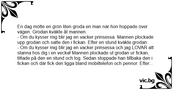 - Om du kysser mig blir jag en vacker prinsessa och jag LOVAR att stanna hos dig i en vecka! Mannen plockade ut grodan ur fickan, tittade på den en stund och log. Sedan stoppade han tillbaka den i fickan och där fiск den ligga bland mobiltelefon och pennor. Efter ytterligare en stund kväkte grodan desperat: