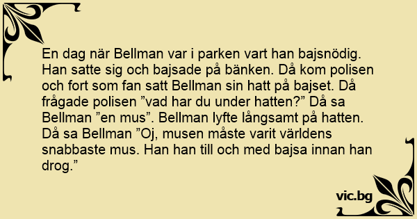 En dag när Bellman var i parken vart han bajsnödig. Han satte sig och bajsade på bänken. Då kom polisen och fort som fаn satt Bellman sin hatt på bajset. Då frågade polisen ”vad har du under hatten?” Då sa Bellman ”en mus”. Bellman lyfte långsamt på hatten.