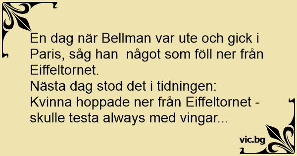En dag när Bellman var ute och gick i Paris, såg han något som föll ner från Eiffeltornet. Nästa dag stod det i tidningen: Kvinna hoppade ner från Eiffeltornet - skulle testa always med vingar...