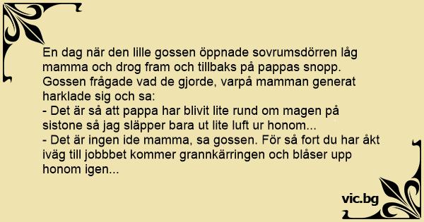 - Mamma, varför guppade du upp och ner på pappas mage igår kväll? - Jag är tvungen att göra så, annars blir pappas mage jättetjock, guppandet håller honom smal. - Det kommer inte att fungera! -...