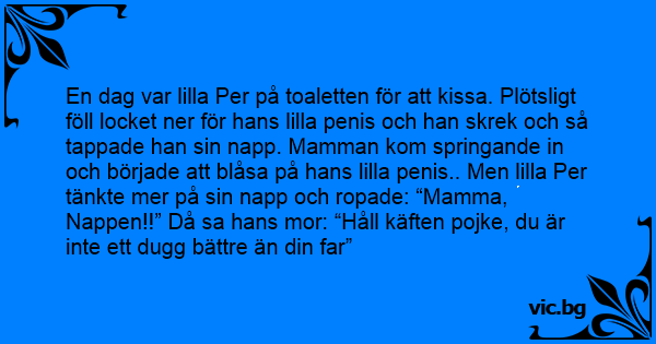 En dag var lilla Per på toaletten för att kissa. Plötsligt föll locket ner för hans lilla реnis och han skrek och så tappade han sin napp. Mamman kom springande in och började att blåsa på hans lilla реnis.. Men lilla Per tänkte mer på sin napp och ropade: “Mamma, Nappen!!” Då sa hans mor: “Håll käften pojke, du är inte ett dugg bättre än din far”