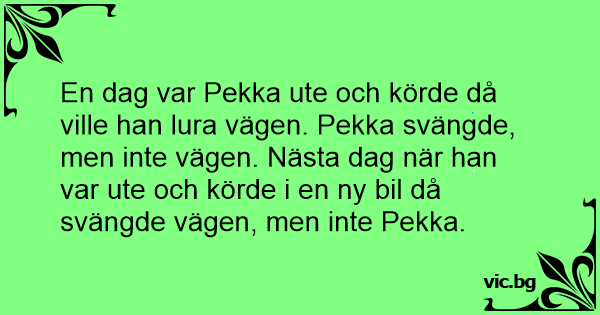 En dag var Pekka ute och körde då ville han lura vägen. Pekka svängde, men inte vägen. Nästa dag när han var ute och körde i en ny bil då svängde vägen, men inte Pekka.