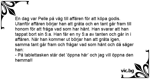 En dag var Pelle på väg till affären för att köpa godis. Utanför affären börjar han att gråta och en tant går fram till honom för att fråga vad som har hänt. Han svarar att han tappat bort sin 5:a. Han får en ny 5:a av tanten och går in i affären. När han kommer ut börjar han att gråta igen, samma tant går fram och frågar vad som hänt och då säger han: