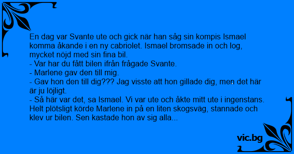 En dag var Svante ute och gick när han såg sin kompis Ismael komma åkande i en ny cabriolet. Ismael bromsade in och log, mycket nöjd med sin fina bil.