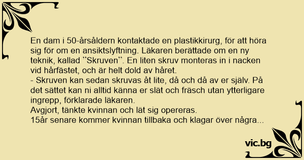 En dam i 50-årsåldern kontaktade en plastikkirurg, för att höra sig för om en ansiktslyftning. Läkaren berättade om en ny teknik, kallad Skruven. En liten skruv monteras in i nacken vid hårfästet, och är helt dold av håret.