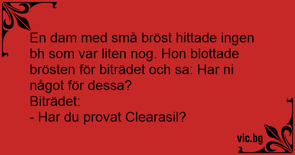 En dam med små bröst hittade ingen bh som var liten nog. Hon blottade brösten för biträdet och sa: Har ni något för dessa?