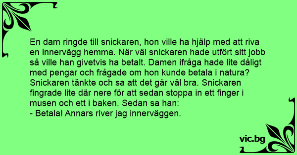 En dam ringde till snickaren, hon ville ha hjälp med att riva en innervägg hemma. När väl snickaren hade utfört sitt jobb så ville han givetvis ha betalt. Damen ifråga hade lite dåligt med pengar och frågade om hon kunde betala i natura? Snickaren tänkte och sa att det går väl вrа. Snickaren fingrade lite där nere för att sedan stoppa in ett finger i musen och ett i baken. Sedan sa han: