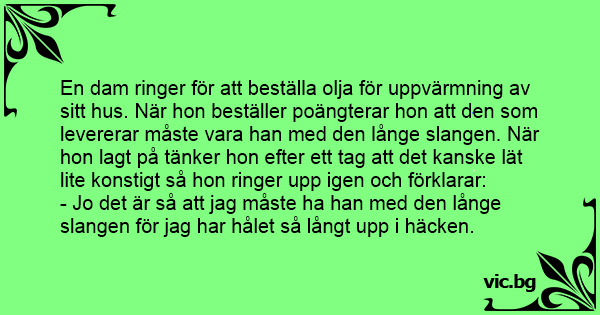En dam ringer för att beställa olja för uppvärmning av sitt hus. När hon beställer poängterar hon att den som levererar måste vara han med den långe slangen. När hon lagt på tänker hon efter ett tag att det kanske lät lite konstigt så hon ringer upp igen och förklarar: