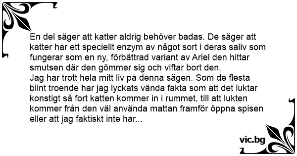 En del säger att katter aldrig behöver badas. De säger att katter har ett speciellt enzym av något sort i deras saliv som fungerar som en ny, förbättrad variant av Ariel den hittar smutsen där den gömmer sig och viftar bort den. Jag har trott hela mitt liv på denna sägen. Som de flesta blint troende har jag lyckats vända fakta som att det luktar konstigt så fort katten kommer in i rummet, till att lukten kommer från den väl använda mattan framför öppna spisen eller att jag faktiskt inte har dammsugit under soffan på några veckor. Den dag kommer dock, då en man måste se massan i ansiket och säga att - den här katten luktar som en allmän toalett under en het dag i Stockholm... När den dagen kommer till ditt hus, som den har kommit till mitt, kanske några råd kan vara på plats, då du tar din pälsklädda vän under armen och tar ut bäringen mot badrummet: 1. Tänk på att även om katten har fördelen av snabbhet och brist på omtanke över det mänskliga livet, så har du styrkans fördel. Utnyttja denna fördel och välj rätt slagfält. Välj inte att bada honom på en öppen area där han kan tvinga dig att jaga honom. Välj ett väldigt litet badrum. Om det är större än 1 gånger 1 meter, kan jag rekommendera att du stiger ned i badkaret med katten och stänger glasdörrarna. (Ett vanligt duschförhängae duger inte. En katt som går bärsärkagång kan strimla ett tredubbelt duschförhänge snabbare än en politiker kan ändra åsikt.) 2. Tänk på att en katt har klor och tvekar inte en sekund på att skilja din hud från din kropp. Din fördel här är att du är smart och vet hur du ska klä dig. Jag kan rekommendera segelduksoverall, istoppade i byggnadsstövlar som räcker till knäna, ett par stålbrynjehandskar, en armhjälm, en hockeymask och en långärmad luftvärnsjacka. 3. Förbered allting i förväg. Det finns absolut ingen tid för att stiga upp ur badet för att hämta en handduk när du har en katt som just då gräver ett hål i din luftvärnsjacka. Häll upp vattnet. Kom ihåg att flaskan med kattschampoo är inne i duschkabinen. Se till att handduken kan nås, även om du liggеr på rygg i vattnet. 4. Använd överraskningsmomentet. Ta upp din katt nonchalant, som om du bara skulle ta med honom till köket och hans matskål. (Katter brukar inte bry sig om din utstyrsel. De har som regel lite eller inget intresse av mode. Om han dock undrar över dina klumpiga kläder, förklara lugnt att du deltar i ett produkttest sponsrat av Helly Hansen.) 5. När du väl är inne i badrummet är snabbhet väsentligt för överlevnad. I en enda rörelse måste du öppna glasdörren, glida ned i karet, stänga dörren om er, doppa katten i vattnet och spruta schampo över katten. Du har nu påbörjat dina vildaste 45 sekunder i ditt liv. 6. Katter har inga handtag. Lägg till det faktum att han nu har såpig päls och ditt läge har förvärrats avsevärt. Förvänta dig inte att få hålla katten mer än två eller tre sekunder åt gången. Dock, när du väl håller honom, får du inte glömma att ge honom en dos av schampot och gnugga som en besatt. Efter det kommer han att riva sig fri, och faller då baklänges ned i vattnet, varpå han sköljer av sig schampot själv. (Världsrekordet för katter är tre schamponeringar, så förvänta dig inte för mycket.) 7. Härnäst måste katten torkas. Ovana kattbadare tror alltid att detta led är det svåraste, eftersom människan nu är utpumpad medan katten är väldigt bestämd. Faktum är att torkningen är inget med vad du just gått igenom. Detta på grund av att katten nu sitter som klistrad mot ditt högra smalben. Du tömmer helt enkelt karet genom att peta ur pluggen med din fot, sträcker dig efter handduken och väntar. (Det skall dock tilläggas att katten ibland kan arbeta sig upp mot ditt huvud och slutar som ett naturligt bihang till din armhjälm. Skulle detta hända är det bästa du kan göra att helt enkelt skaka loss honom och uppmuntra honom att säтта sig på benet.) När allt vatten har runnit ut ur karet, är det bara att sträcka sig ner och torka katten. Efter några dagar har katten slappnat av så mycket att du kan ta loss honom från benet. Han har vanligtvis inget att säga de kommande tre veckorna och kommer att tillbringa merparten av sin tid med att sitta med ryggen vänd mot dig. Du kommer då att förmoda att han är arg. Detta är oftast inte fallet. Som regel håller han bara på att utarbeta sätt att komma igenom ditt försvar och skada dig för livet nästa gång du ger honom ett bad. Men nu luktar han i alla fall вrа mycket bättre...