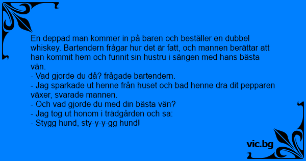 En deppad man kommer in på baren och beställer en dubbel whiskey. Bartendern frågar hur det är fatt, och mannen berättar att han kommit hem och funnit sin hustru i sängen med hans bästa vän.