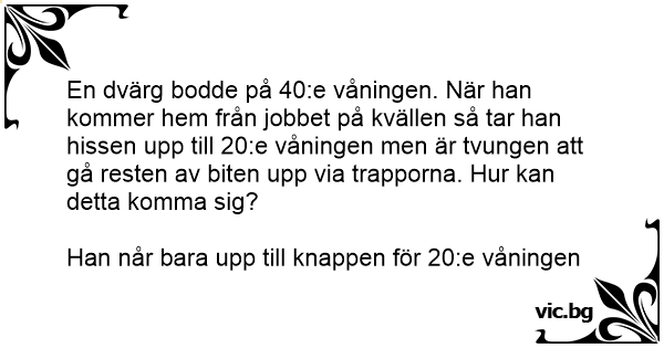 En dvärg bodde på 40:e våningen. När han kommer hem från jobbet på kvällen så tar han hissen upp till 20:e våningen men är tvungen att gå resten av biten upp via trapporna. Hur kan detta komma sig?