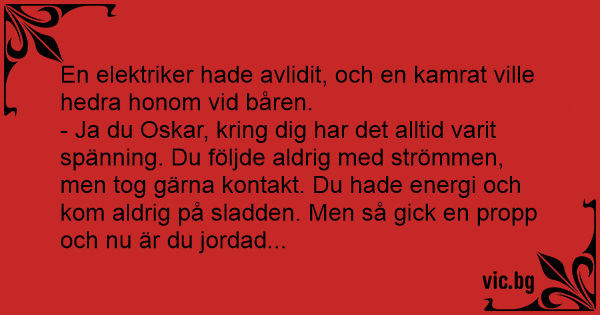 - Ja du Oskar, kring dig har det alltid varit spänning. Du följde aldrig med strömmen, men tog gärna kontakt. Du hade energi och kom aldrig på sladden. Men så gick en propp och nu är du jordad...