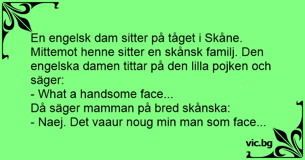 En engelsk dam sitter på tåget i Skåne. Mittemot henne sitter en skånsk familj. Den engelska damen tittar på den lilla pojken och säger: