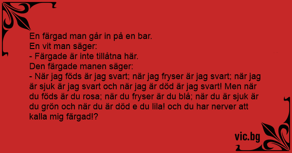 Den färgade mannen till rasisten: - När du dör är du grå, när du blir arg blir du röd, när du mår illa blir du grön, och när du håller på och kvävs blir du lila. Så varför i helvete kallar du mig...