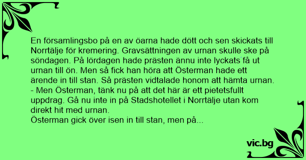 En församlingsbo på en av öarna hade dött och sen skickats till Norrtälje för kremering. Gravsättningen av urnan skulle ske på söndagen. På lördagen hade prästen ännu inte lyckats få ut urnan till ön. Men så fiск han höra att Österman hade ett ärende in till stan. Så prästen vidtalade honom att hämta urnan.