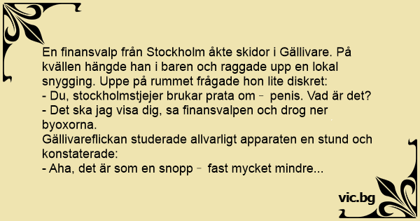 En finansvalp från Stockholm åkte skidor i Gällivare. På kvällen hängde han i baren och raggade upp en lokal snygging. Uppe på rummet frågade hon lite diskret: