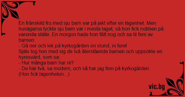 En frånskild fru med sju barn var på jakt efter en lägenhet. Men husägarna tyckte sju barn var i mesta laget, så hon fiск nobben på varenda ställe. En morgon hade hon fått nog och sa til fem av barnen: