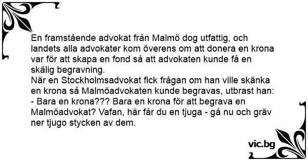 När en Stockholmsadvokat fiск frågan om han ville skänka en krona så Malmöadvokaten kunde begravas, utbrast han: