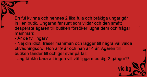- Nej din idiот, fräser mamman och lägger till några väl valda okvädningsord. Hon är 9 år och han är 4 år. Ägaren till butiken tänder till och ger svar på tal: