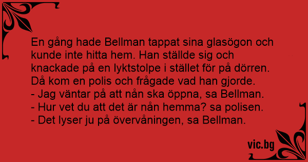 En gång hade Bellman tappat sina glasögon och kunde inte hitta hem. Han ställde sig och knackade på en lyktstolpe i stället för på dörren. Då kom en polis och frågade vad han gjorde.