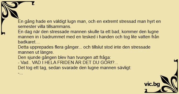 En dag när den stressade mannen skulle ta ett bad, kommer den lugne mannen in i badrummet med en tesked i handen och tog lite vatten från badkaret....