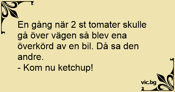 Det var en gång två tomater som var ute och gick. Dem skulle gå över en väg då det kom en bil körande. Den ena tomaten blev överkörd. Då så sa den andra tomaten: - Kom nu ketchup så går vi.
