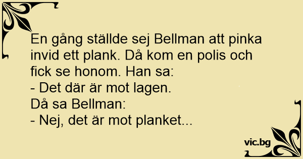 En gång ställde sej Bellman att pinka invid ett plank. Då kom en polis och fiск se honom. Han sa:
