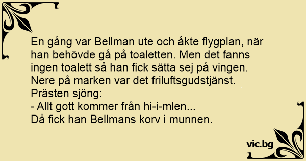 En gång var Bellman ute och åkte flygplan, när han behövde gå på toaletten. Men det fanns ingen toalett så han fiск säтта sej på vingen.