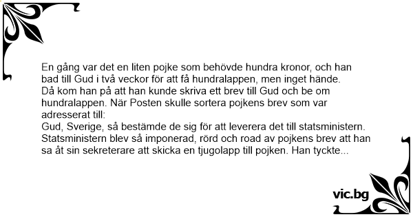 En gång var det en liten pojke som behövde hundra kronor, och han bad till Gud i två veckor för att få hundralappen, men inget hände. Då kom han på att han kunde skriva ett brev till Gud och be om hundralappen. När Posten skulle sortera pojkens brev som var adresserat till: Gud, Sverige, så bestämde de sig för att leverera det till statsministern. Statsministern blev så imponerad, rörd och road av pojkens brev att han sa åt sin sekreterare att skicka en tjugolapp till pojken. Han tyckte det borde vara mycket pengar för ett barn. Pojken blev glad över att få pengar från Gud, så han satte sig ner för att skriva ett tackbrev: - Kära Gud, tack för att du skickade pengarna till mig. Men jag märkte att du av någon anledning sände det via Stockholm, och som vanligt så drog de jävlarna av 80%...