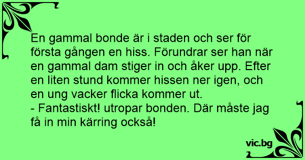 En gammal bonde är i staden och ser för första gången en hiss. Förundrar ser han när en gammal dam stiger in och åker upp. Efter en liten stund kommer hissen ner igen, och en ung vacker flicka kommer ut.