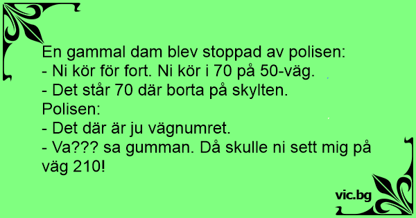 Полицай спира на магистралата една стара дама, която кара с 25 км/ч. Дамата пита: - Защо ме спряхте, аз спазвам ограничението. Ето, на табелата пише А 25 и аз карам с 25 км/ч. - Но, госпожо, това е номер на магистралата, а не ограничение на скоростта. Добре, тръгвайте, но виждам, че спътничката...