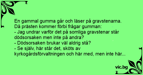 En gammal gumma går och läser på gravstenarna. Då prästen kommer förbi frågar gumman: