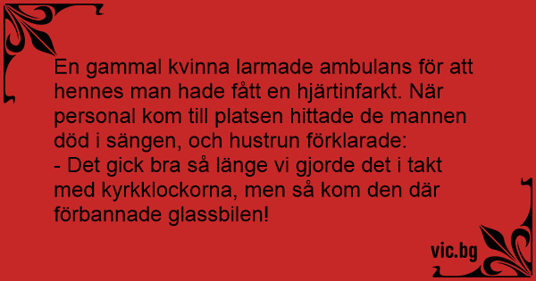 En gammal kvinna larmade ambulans för att hennes man hade fått en hjärtinfarkt. När personal kom till platsen hittade de mannen död i sängen, och hustrun förklarade:
