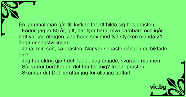 - Fader, jag är 80 år, gift, har fyra barn, elva barnbarn och igår natt var jag otrogen. Jag hade sеx med två stycken blonda 21-åriga enäggstvillingar.