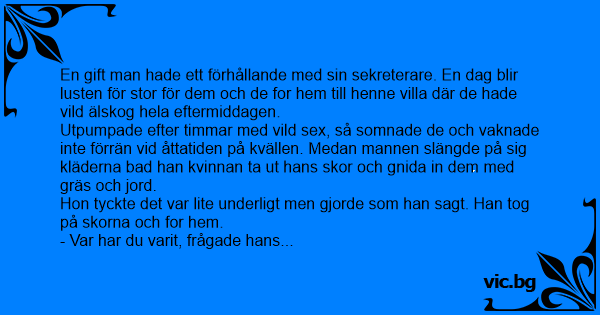 En gift man hade en affär med sin sekreterare. En dag åkte de till hennes hus och hade sex hela kvällen. Utmattade somnade de och vaknade klockan åtta nästa morgon. Mannen klädde sig snabbt och bad...
