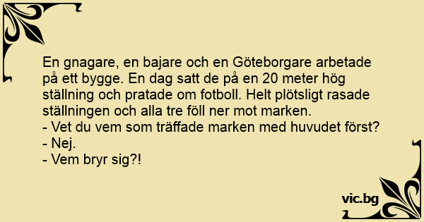 En gnagare, en bajare och en Göteborgare arbetade på ett bygge. En dag satt de på en 20 meter hög ställning och pratade om fotboll. Helt plötsligt rasade ställningen och alla tre föll ner mot marken.