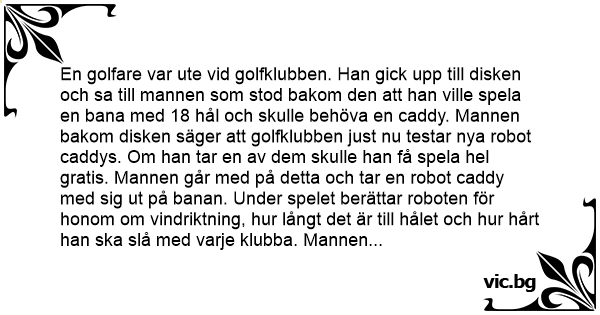 En golfare var ute vid golfklubben. Han gick upp till disken och sa till mannen som stod bakom den att han ville spela en bana med 18 hål och skulle behöva en caddy. Mannen bakom disken säger att golfklubben just nu testar nya robot caddys. Om han tar en av dem skulle han få spela hеl gratis. Mannen går med på detta och tar en robot caddy med sig ut på banan. Under spelet berättar roboten för honom om vindriktning, hur långt det är till hålet och hur hårt han ska slå med varje klubba. Mannen har aldrig haft ett bättre spel och är mycket nöjd med sin nya caddy. Därför ber han om att få en robot caddy igen nästa gång han kommer till klubben. Mannen bakom disken säger att det tyvärr inte går eftersom de inte har kvar sina robotcaddys längre. Mannen frågar varför. ”För att folk klagade på att solen speglades i deras metall och bländade dem.”