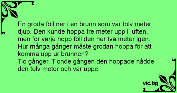 En groda föll ner i en brunn som var tolv meter djup. Den kunde hoppa tre meter upp i luften, men för varje hopp föll den ner två meter igen. Hur många gånger måste grodan hoppa för att komma upp ur brunnen?