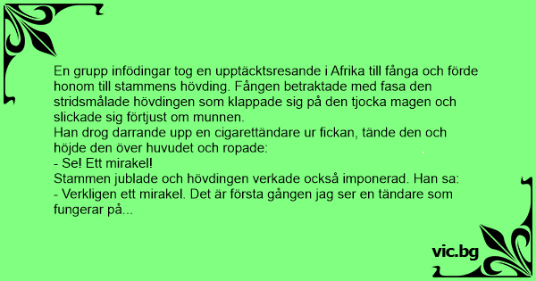 En grupp infödingar tog en upptäcktsresande i Afrika till fånga och förde honom till stammens hövding. Fången betraktade med fasa den stridsmålade hövdingen som klappade sig på den tjocka magen och slickade sig förtjust om munnen.